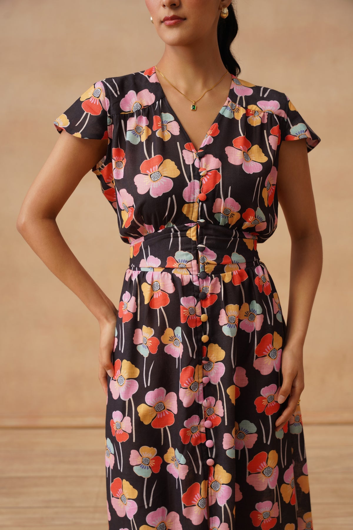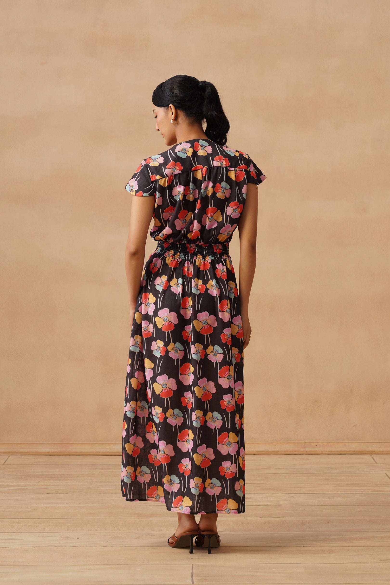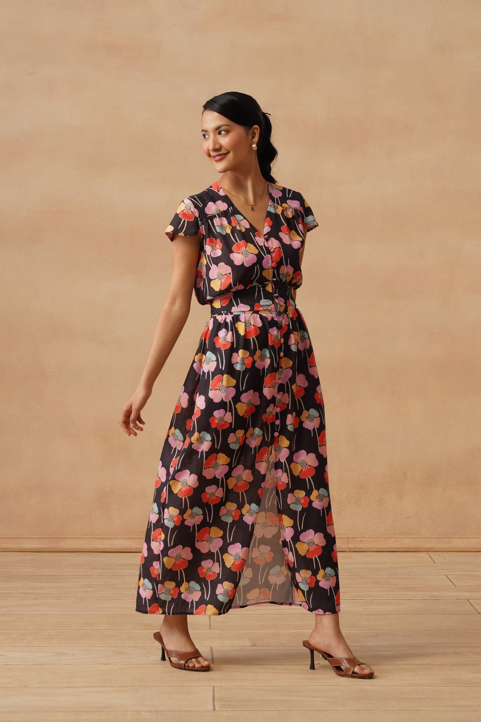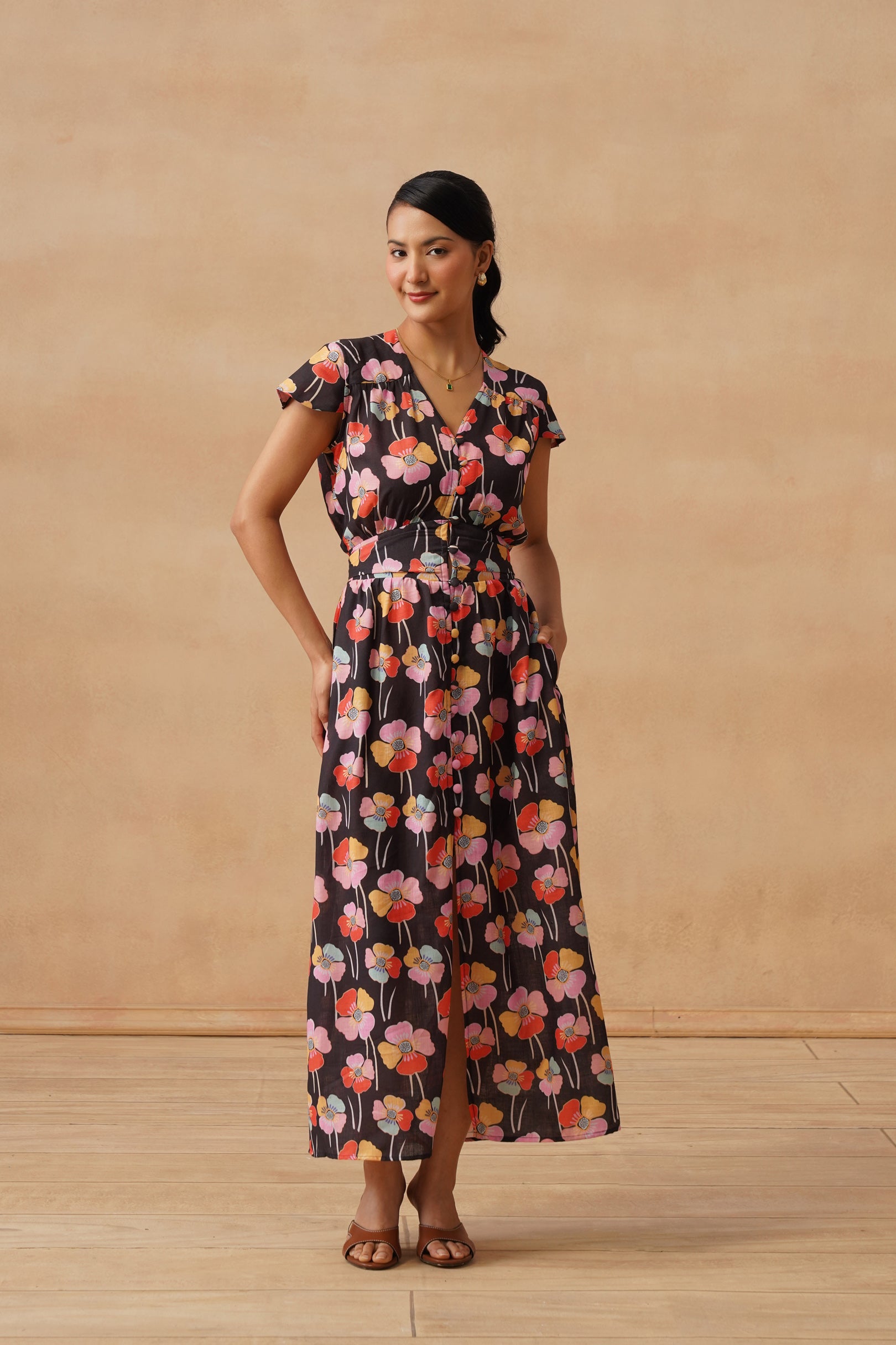 A vibrant maxi dress that captures effortless femininity with a playful edge. Crafted in a lightweight fabric, it features a flattering V-neckline, soft cap sleeves, and a cinched waist that flows into an easy, fluid silhouette. The bold floral print adds a lively charm, making it perfect for both day and evening wear.
