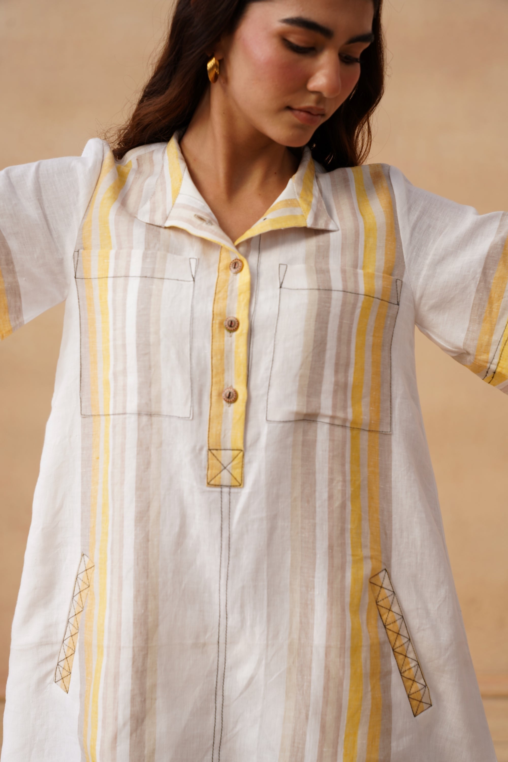 A refined take on everyday ease, this dress is crafted in breathable cotton-linen and elevated with thoughtful contrast details. The classic silhouette is accented by bold stitch lines and dual patch pockets with matching buttons for a subtle pop.
